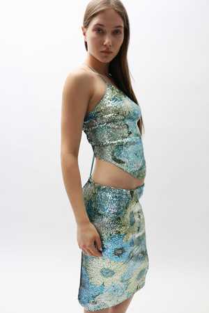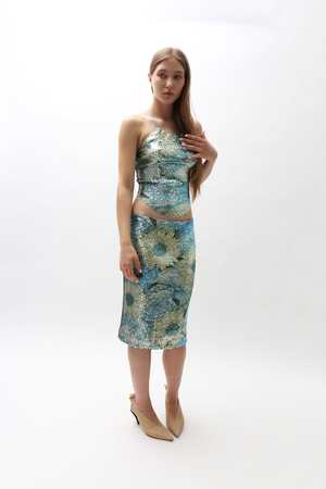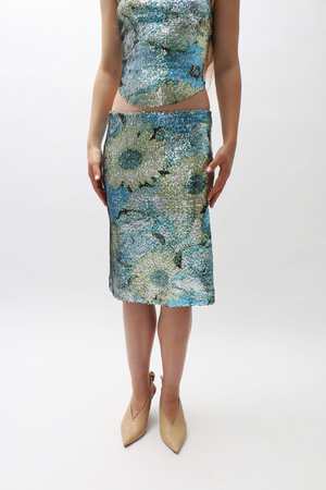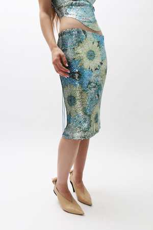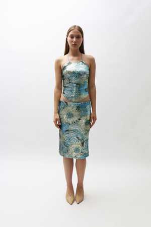 Shimmering sequins in a gradient of oceanic blues and greens bring Priscaveras floral-inspired design to life on this straight-cut midi skirt. The stretch fabric and elasticized waistband offer a comfortable, flattering fit, while the clean, bound interior seams add a polished finish.