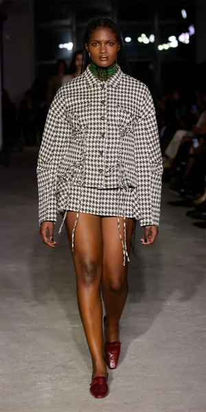 Capture timeless elegance in the PRISCAVera Houndstooth Stretch Wool Ruffle Mini Skirt. Constructed from a premium stretch wool houndstooth fabric, this mini skirt sits at a mid-rise with a ruffle hem for a retro-inspired look. Crafted with care in NYC, it's a chic statement piece. Details: - Color: Houndstooth - 100% PL - Stretch wool rainwear fabric - Zipper and button closure - Belt loops - Mid rise - Fits true to size - Model is 5ft 5in and is wearing a size S