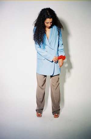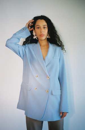 A suit jacket made of silk, tailored for a fit of casual elegance in Periwinkle, a blue color. Classic double-breasted suit jacket with back vent. Silk lining. Worn with the Taupe Low Rise Suit Trousers and the Ruby Carnation Scrunchie.