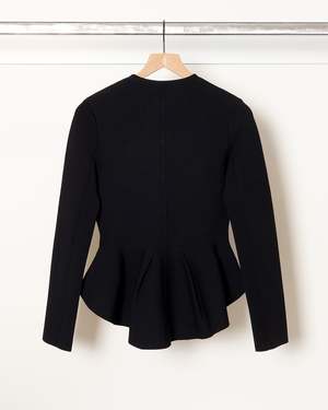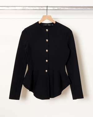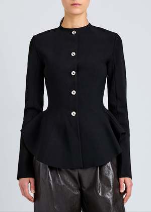 The Dasha Jacket is a sharp, sculptural statement, defined by its peplum silhouette and precisely placed flounce that creates volume and shape at the waist. Polished silver dome buttons add a modern, architectural touch. - High neckline for a clean, refined profile - Long sleeves with a sleek, tailored line - Accentuated flounce at the waist for sculptural volume - A peplum silhouette that defines and flatters the figure - Silver dome button fastenings at the front for a contemporary edge - The model is 5'10" (32" bust and 34" hips), wearing size small 62% Viscose, 36% Polyamide, 2% Lycra. Imported.