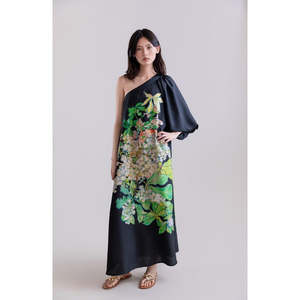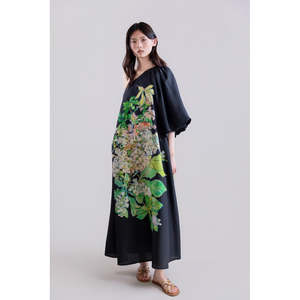 This silk habotai dress combines fluid elegance and contemporary design in an ethereal, sophisticated silhouette. Its asymmetrical one-shoulder neckline adds a modern, feminine touch, while the dropped shoulder sleeves balance the line, creating natural movement and lightness with every step. The drape of the fabric accentuates the fluid silhouette, creating an enveloping effect that combines softness and sophistication. The Hydrangea Brush print, with large flowers and stylized leaves in strokes inspired by hand painting, adds dynamism and artistic character, enriching the visual texture of the silk and enhancing the feeling of understated luxury. A design conceived for the woman who seeks a balance between contemporary elegance, restrained femininity, and artistic graphic detail, ideal for special events and sophisticated looks. 100% silk habotai - Hand wash with neutral soap, separately and inside out, max. 30C - Do not bleach or use chlorine bleach - Iron at medium temperature and inside out, max. 150C - Professional dry cleaning with perchloroethylene, delicate cycle - Do not tumble dry - Silk habotai: light and soft natural silk, with a matte finish and delicate feel. - It stands out for its fluidity and breathability, providing an elegant and natural drape. - It enhances the silhouette with movement and lightness, ideal for long and wrap dresses. - It provides a cool and comfortable feeling, perfect for temperate and warm climates. - Timeless elegance that suits both special occasions and more refined everyday use. Type: Dresses