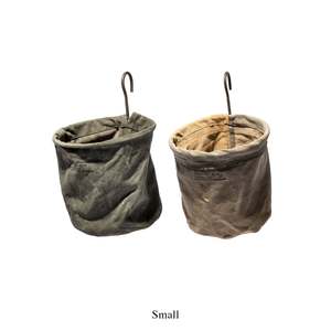 These baskets are made from repurposed fabric from used military tents. The fabric may include assorted colors originally used for different environments, such as green, beige, and white. A washed tent is carefully cut to avoid metal eyelets and windows, and some pieces may be sewn together to create larger panels. As a result, no two finished baskets are exactly alike. Available sizes: - Small No. 107387: Approx. H 14 in. x W 10 in. x D 12 in. - Large No. 107394: Approx. H 22 in. x W 14 in. x D 16 in. Material: Repurposed Fabric (Cotton, others), Steel. Note: This product is made by repurposing used camping tents. Due to the age and prior use of the material, dirt, rust, tears, and holes may be present. Friction may cause dirt and dyes to transfer to other items such as clothing. Because the fabric may weaken over time, it can be damaged by washing. Color and design will be assorted. Handmade production and recycled materials give each piece a unique character and sense of history.