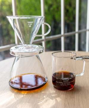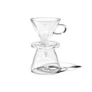 The Glass Coffee Dripper Set by Puebco is a key piece of equipment for hand brewing coffee. Area: China No.301648 Dripper Size: H 4 in. x W 5 in. x D 4 in. Pot Size: H 4 in. x W 4 in. x D 4 in. Material: Borosilicate Glass (Heat-resistant)
