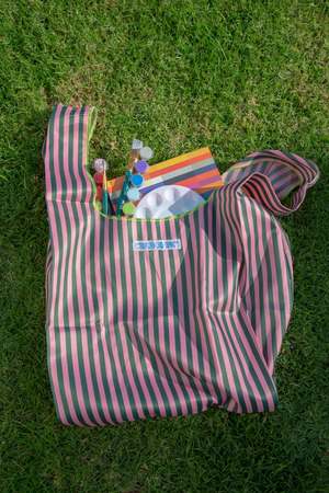 The School Tie Fabric Bag is a lightweight, durable bag designed for everyday use, including grocery runs and casual outings. It features a variety of vibrant striped patterns and offers an easy way to carry daily essentials. Dimensions (approx.): 17.3"W x 7.8"D x 26.7"H Material: Polyester Note: Some of the fabric edges are finished using a lock sewing machine. With use, the threads in the locked areas may become frayed, and the fabric edges may also fray. Minor weaving scratches, fraying, or some dirt may also be present.