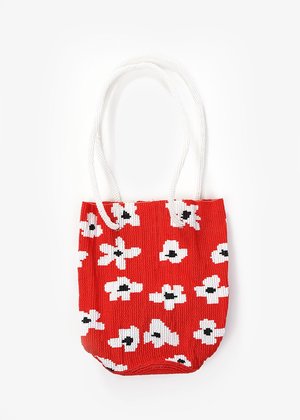 Red beaded bag with white flowers throughout and white straps that can be worn either as a crossbody or on your wrist. These handmade beaded bags take seven days to make from start to finish and are only made-to-order. The top part of the bag is handwoven and the bottom is embroidered, making it hard and durable so the pouch doesn't collapse when you add things inside. Mindfully hand-crafted by Mayan women in a beadwork cooperative based in Guatemala. Also available in grey. MEASUREMENTS TBD.
