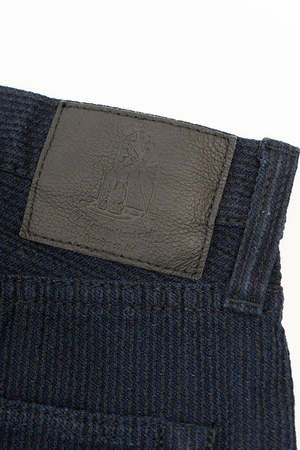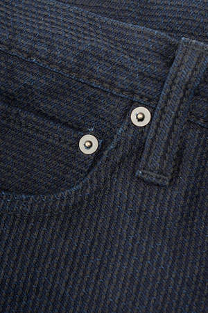 Pure Blue Japan's Woven Sashiko 5 Pockets Pants feature a unique indigo sashiko woven pattern with a relaxed, tapered fit. The jeans are rinsed for comfort and crafted from 100% cotton. Made in Japan.