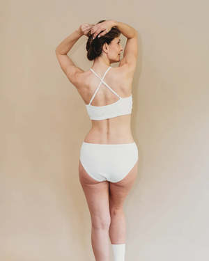 Experience ultimate comfort with our crossover bralette made from 100% GOTS-certified organic cotton. Say goodbye to the discomfort of traditional bras and try our alternative! Customize your fit with adjustable cotton straps. Ethically made in a family-run, GOTS-certified factory in India, this bralette is free from harmful chemicals and dyed with low-impact, azo-free dyes suitable for sensitive skin. Note: The straps are made of cotton. This bra does not provide enough support for sports and is ideal for cup sizes A to D. Non-toxic, azo-free dyes: Some azo dyes (also called direct dyes) can break down and release chemicals called aromatic amines, some of which are carcinogenic. We use only non-toxic, environmentally friendly dyes that do not degrade or release harmful compounds. Care: For best results, wash cold and lay flat to dry. If needed, tumble dry on low heat.