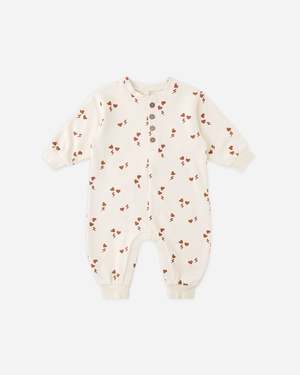 This organic French terry jumpsuit is a cozy and fun wardrobe staple. It is designed with coconut buttons down the front and gathered wrists and ankles for a snug fit. Sizes 0-3m to 18-24m feature hidden snaps along the inseam for easy changes. Featuring the 'electric heart' print a darling look for little ones. Care: Machine wash cold. Tumble dry low. Made of 96% organic cotton / 4% elastane.
