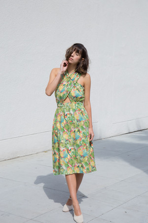 samantha wrap halter dress by rachel antonoff. + playful cactus print halter dress + fitted waistband, gathered skirt + features side pockets, snap closure at front bodice + 100% rayon body, 100% cotton lining