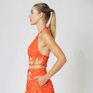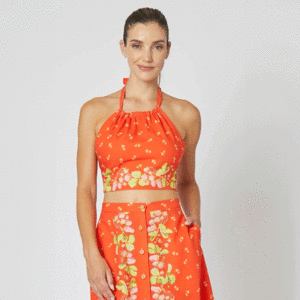 If youre saving your clavicle for marriage, look elsewhereMiranda is all about showing off that tempting dcolletage! Storybook strawberries sprawl across a burnt orange tie-neck halter, giving this hot top a hint of 70s sweetness. Pair with the Talia skirt for a traipse through your local wildflower field or a sprint through your local subway stationyoure sure to look ethereal either way! Composition: 52% Linen, 48% Cotton Fit: Cropped halter top with drawstring neckline. Fits true to size.