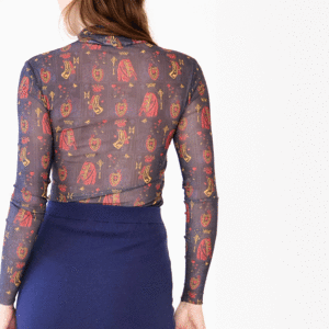 A slinky, sheer mesh turtleneck featuring an all-over playing card print. Perfect for layering under a sweater or wearing alone as a statement piece. Composition: 92% Polyester, 8% Spandex Fit: True to size; model is 5'10" wearing a size S.