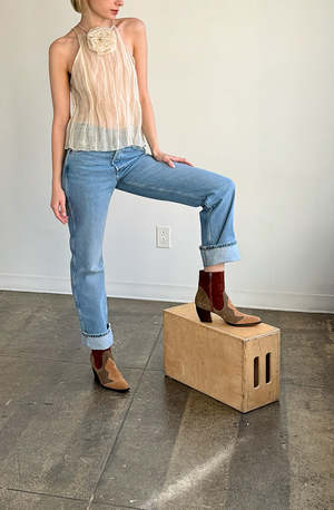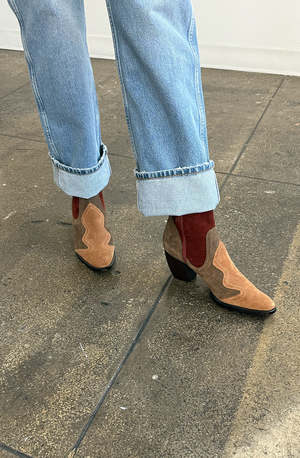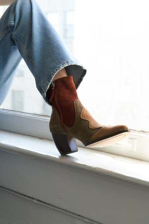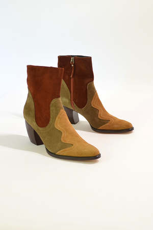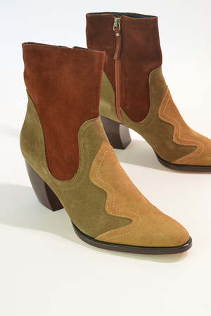 Cowboy-inspired bootie featuring a striking patchwork design with three suede colors. Includes a zipper closure at the inner ankle and a hand-carved heel. - 100% Leather Upper, Sole: 100% Leather - 60mm heel - Zipper closure at inner ankle - Made in Peru