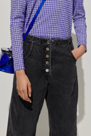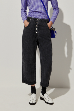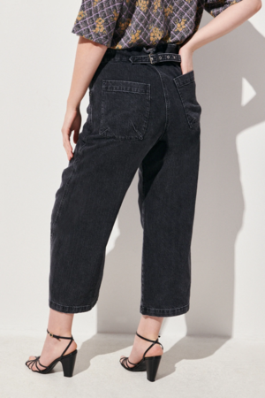 An RC essential pant. Wear on the hips or tighten the back strap to sit higher at the natural waist. Angled darts give the leg a subtle cocoon shape that ends in a slight crop. - Mid rise - Exposed button fly closure - Five pocket style - Buckle tab adjustment at back waist MATERIAL & CARE 100% Cotton Denim FIT Melissa is 5'11" (180cm) and wears a size 10. Samya is 59.5 (176 cm) and wears a size 4. Made in USA
