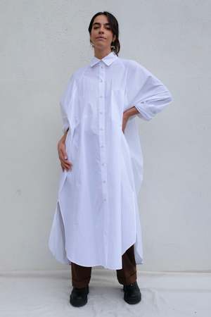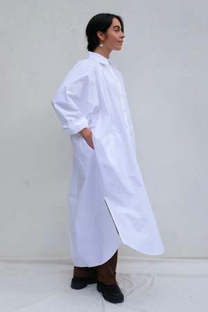 Expertly crafted cotton shirt dress with a timeless collar and button placket, enhanced by stylish side slits. Features an exaggerated front pocket and a unique square seam at the back. Roll up the sleeves for an effortlessly, casual yet chic look. Details: - 100% Cotton - Made in USA Chline is 5'9", bust 35", waist 25", hips 37", wearing size XS/S
