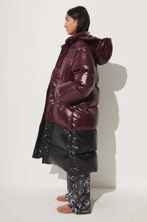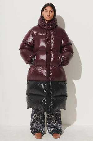 Long, glossy down-insulated paneled puffer coat with a high neck and detachable hood. Features internal ribbon straps so you can slip out of the arms and carry the coat when inside. Responsible Down certified. 100% Nylon Outer, 100% Down Fill Zipper and button closure Detachable hood Elasticized cuffs Side welt pockets Internal zipper pocket Made in China
