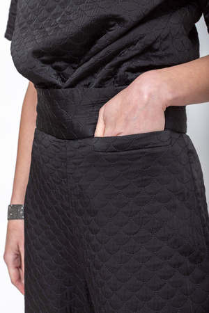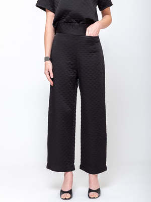 High-waisted pants with a straight, relaxed leg, cut from quilted textured fabric. Features a wide waistband and subtle vertical seaming throughout. Designed with front and back darts for shaping. - 100% Viscose - Concealed zip closure at back - Belt loops - Front welt pocket - Made in India