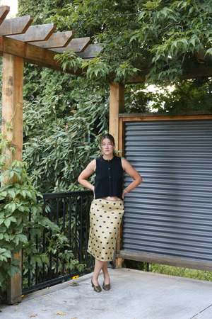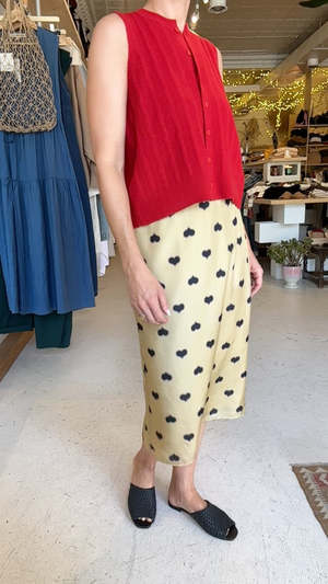 Low rise pencil slip skirt in soft heat-print silk. Fitted with a hidden side zipper and scalloped elastic detail at the waist. Back slit for movement. Details: - 100% silk with polyester lining and elastic trim - Made in USA Ailie is 5'8, 36" bust, 27" waist, 39" hips, wearing a size 6. Miya is 5'5", bust 34", waist 28", hips 36", wearing size 4.