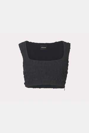 This sleeveless, cropped top features a square neckline and is crafted from a textured fabric, offering a refined and elegant silhouette. 50% Polyester, 25% Nylon, 25% Elastane Made in USA Style: 253W-316-J1834