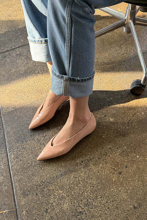 Leather ballet flats with a pointed toe and slip-on design. Features a crinkled patent leather finish with a seamless upper and a low-cut almond vamp. - 100% Leather - Made in Peru