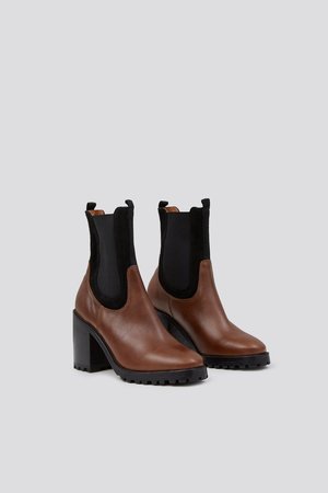 - Heeled Chelsea ankle boot - Rounded toe - Pulls on with ankle tab and elasticized gore - Stacked leather heel - Tread sole - 75mm heel - Upper and Sole in 100% Cow Leather, Tread in 100% Rubber - Made in Peru