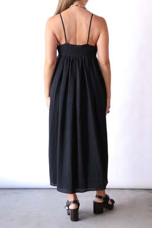 This sleeveless midi dress features an empire waist and gathered skirt, made from a lightweight and textured fabric. Adjustable spaghetti straps and a contrasting sweetheart-inspired neckline create a fluid and airy silhouette. - 80% Tencel, 20% Nylon - Spaghetti straps - Made in USA