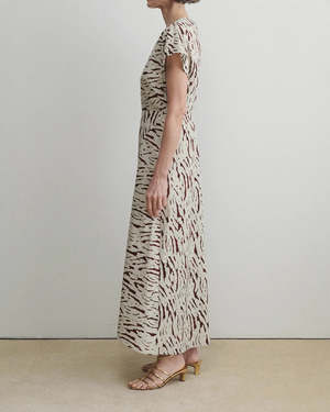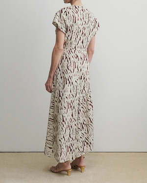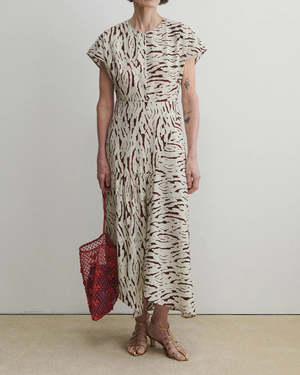 The Steady Dress in Organic Cotton in Cream by Rachel Comey is a midi dress featuring an asymmetrical hem, cap sleeves, and a modern print. It has a fitted waist, round neckline, and back button closure. Made in USA. Style it with a heel or midi boot.