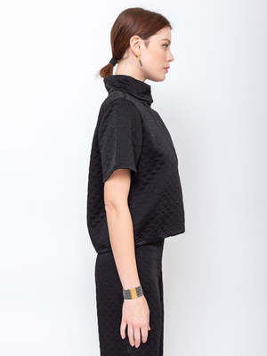 Novelty top with a relaxed sweatshirt fit, cut from a textured, quilted fabric. Features a high mock neck collar, short wide sleeves, and a straight hem with light gathering for a subtle shape. Designed with a minimalist front placket and loose silhouette for effortless layering. - 100% Viscose - Slip-on style - Soft quilted fabrication - Mock neck - Made in India