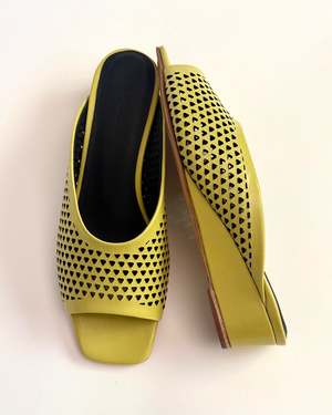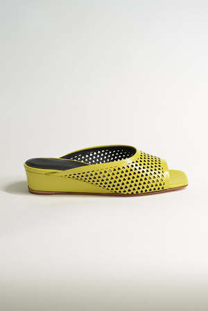 The Rachel Comey Balant Wedge is an open-toe sandal crafted in crinkle patent leather with mini perforations. The softly squared toe and slip-on design offer effortless style, while the contoured footbed with padded insoles ensures all-day comfort. Finished with a leather sole and low wedge heel for subtle lift and stability.