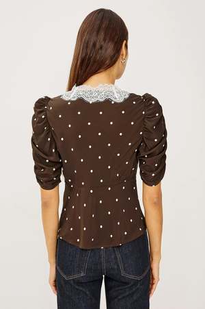 Crafted from luxurious crepe with a subtle sheen and fluid drape, the Lazara top from RAILS CLOTHING features a V-neckline trimmed with lace and a charming polka-dot print. Three-quarter puff sleeves with delicate gathering flatter the silhouette and add movement for versatile elegance from day to night. Details: - Fitted silhouette - Deep V-neckline with lace details - Invisible side zip closure - 3/4 puff sleeves with gathers - Front length: 21 5/8" / 55 cm (measured on size S) - Color: Cocoa Polka Dots - We recommend ordering your usual size - 70% rayon, 30% viscose - Dry clean only