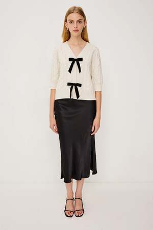 Timeless and romantic, the Clarissa sweater by RAILS celebrates elegance with its contrasting velvet loops. Crafted in an incomparably soft cable knit, this cropped and relaxed sweater features 3/4 puff sleeves and an invisible snap closure at the front. Pair this style with jeans or for festive occasions. Details: - Straight fit. - V-neck. - 3/4 puff sleeves. - Ribbed hems. - Velvet loop details. - Front length: 20 1/4" / 51.4 cm (measured for size S). - Color: Ivory Cables. - We recommend ordering your usual size. - 25% merino wool, 45% recycled nylon and lurex, 30% organic cotton. - Dry clean only.