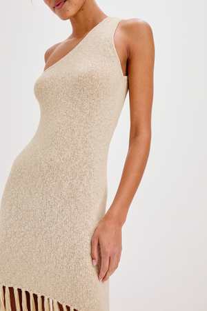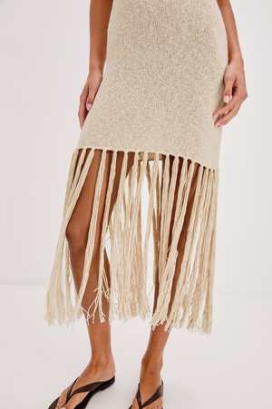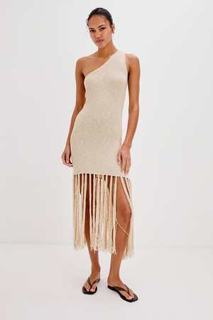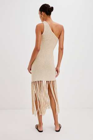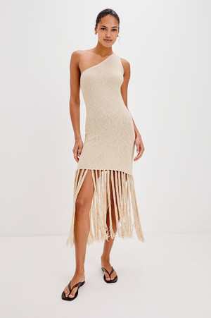 The Antonia Dress by Rails features an asymmetrical high neckline and knotted fringe details, crafted from a breathable cotton-linen blend for comfort. This original midi dress is sure to turn headsperfect for the beach or summer outings. Details: - Fitted silhouette - Asymmetrical one-shoulder high neckline - Fringe at the lower hem - Front length: 31 1/2" / 80 cm (measured from size S) - Unlined - Pull-on style - Color: Natural Fit: True to size Fabric: 64% cotton, 20% nylon, 16% linen Care: Hand wash