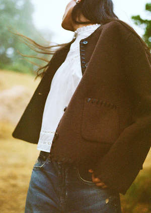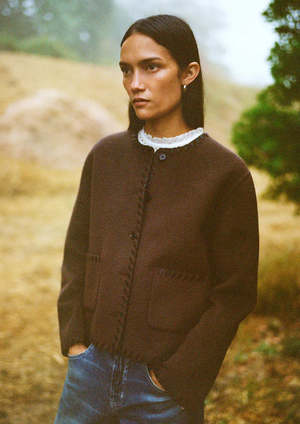 The Melanie jacket by RAILS CLOTHING is crafted from thick wool, offering both elegance and comfort. Its unique, refined style features contrast stitching, buttons, and a boxy cut. Wear it indoors or outdoors with your favorite jeans. Details: - Boxy cut - Crew neck - Front button closure - Patch front pockets - Front length: 22 1/2" / 57 cm (measured on size S) - Color: Dark Brown - We recommend ordering your usual size. - 51% wool, 49% polyester - Dry clean only.