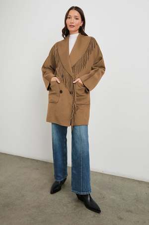 description: Bundle up in the Hugo, a shawl-coat hybrid destined to turn heads. This heavy wool blend coat is double-breasted and double-faced, with a functioning inner button for added warmth. Complete with wide lapels, patch pockets, and fringe details, the Hugo is the kind of coat that makes the look. fabric: 51% Wool, 49% Polyester Dry clean. Cool iron if needed. Do not bleach. Imported measurements: Intentionally oversized. For a more tailored fit, we recommend sizing down. Front Body Length: 35 1/4" (Measured from Small)