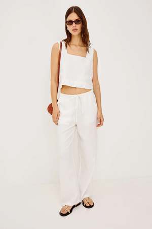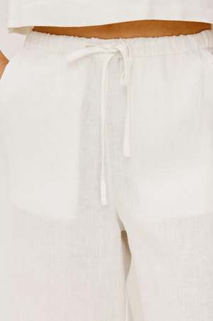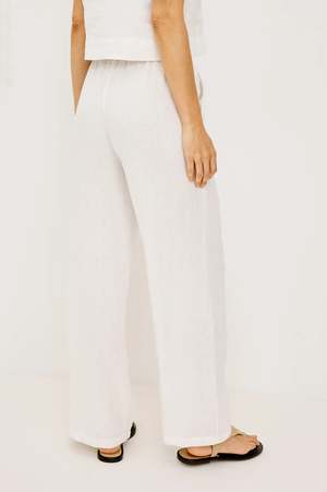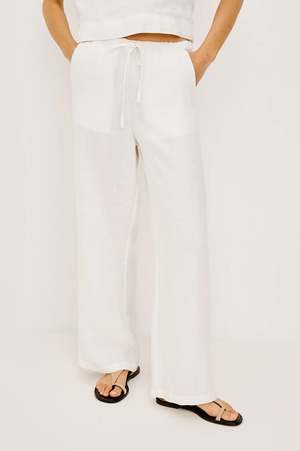 The Emmie is a high-rise, wide-leg pant made from unlined, softly structured linen, with a relaxed fit through the hip and thigh, side pockets, and adjustable drawstring waist ties. Style it back to the Akira Top in White for a matching set. Fabric: 100% Linen Dry clean only. Made in China. Measurements (Size S): Inseam length: 29 1/2" Front rise: 12 1/4" Recommend ordering true to size.