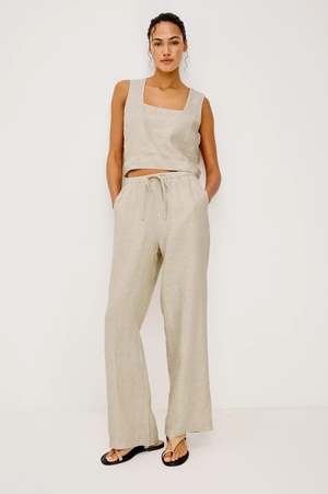 The Emmie is a high-rise, wide-leg pant made from unlined, softly structured linen, with a relaxed fit through the hip and thigh, side pockets, and adjustable drawstring waist ties. Fabric: 100% linen Dry clean only. Made in China. Measurements (Size S): Inseam length: 29 1/2" Front rise: 12 1/4" Fit: Recommend ordering true to size.