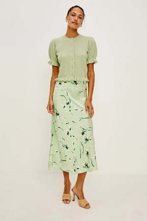 The Anya is a high-rise, body-skimming, bias-cut midi skirt in lustrous satin-back crepe, with a concealed elastic waistband for a polished fit. DESIGNER ID: 507A-271-8607 COLOR: Mint Linnea COMPOSITION: 55% Viscose, 45% Rayon CARE: Machine wash cold FIT: Runs true to size Skirt length: 31 1/4" Imported.