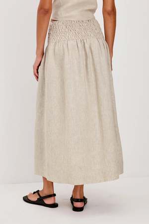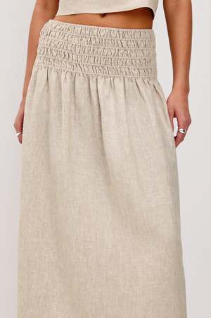 An easy, elevated midi skirt that blends structure with softness. Timeless and versatile, its a piece that works across seasons and occasions. Designed with a high-rise waist and an A-line silhouette, this skirt flatters while allowing for comfortable movement. The lightly structured linen holds its shape, while the smocked waistband adds flexibility and ease. Style it with a simple tank or tee for an effortless daytime look, or pair it with a blouse or knit for something more polished. Details - High-waisted - Midi length - A-line silhouette - Smocked waistband - Fully lined - Skirt length: 36" (size S) - 100% Linen - Lightweight with soft structure - True to size - Dry clean only