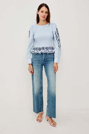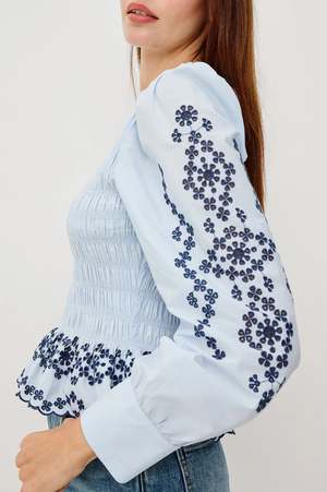 The Tabi blouse embodies sophisticated charm in crisp, lightweight poplin, featuring a smocked body, long puff sleeves with fitted cuffs, contrast embroidery at the sleeves and peplum hem, and a back keyhole with loop-button closure. DESIGNER ID: 670-634B-8461 COLOR: Blue Bird COMPOSITION: 55% cotton, 45% Tencel CARE: Hand wash cold FIT: Runs true to size. Front body length: 20 5/8" (measured from size S.) Imported.