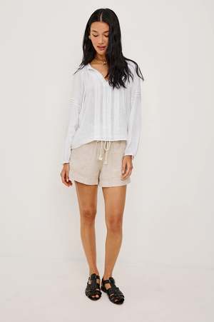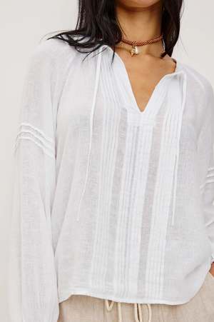An airy, feminine blouse that feels effortless yet elevated. The soft drape, delicate detailing, and billowy sleeves give it a romantic feel youll keep reaching for. Designed with a loose, flowing silhouette, this top drapes beautifully through the body for a relaxed, lightweight feel. The linen blend keeps it breathable, while the soft structure and seam detailing add subtle dimension. Perfect for warm, easy days. Pair it with linen shorts or denim for a relaxed daytime look, or style it with tailored trousers for a more polished feel. Details - Loose, relaxed fit - Split V-neckline with self-ties - Long billowing sleeves - Fitted cuffs - Intricate seam detailing - Front body length: 23" (size S) - 55% Linen, 45% Ecovero Rayon - Lightweight and breathable - True to size - Hand wash cold, hang to dry