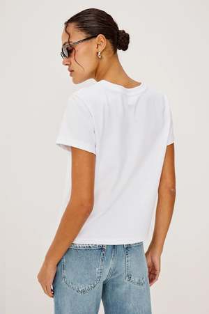 Boyfriend comfort, made for you. The Girlfriend Tee is crafted from pleated jersey with a luxe feel and smooth finish, featuring a slightly boxy, cropped silhouette. Fabric: 100% Cotton Machine wash cold. Separate in gentle cycle. Hand dry. Do not bleach. Cool iron if needed. Made in China. Measurements: Front body length: 22 3/4" (measured from size Small).