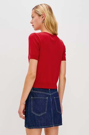 The Aisley is a short-sleeve sweater in a luxe cotton-cashmere blend. With a semi-fitted cut that layers easily or stands alone, it's finished with elegant pearl buttons. 70% Cotton | 30% Cashmere. Front Body Length: 21" (Measured from size S).