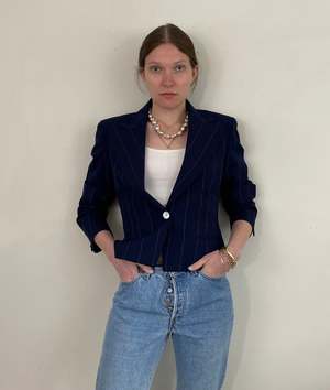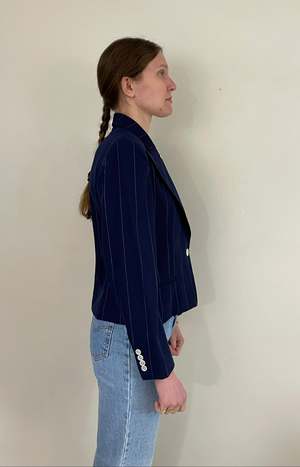 Vintage Ralph Lauren 100% wool blazer from the 1980s/1990s. Features a cropped length, peaked lapels, single abalone shell button closure, and a nipped waist in lightweight pinstriped wool. The blazer is a neutral navy blue with silk lining and welt hip pockets, showcasing impeccable construction and a timeless cut. Made in USA. Tagged size 6. Model is 5'8" and typically wears size 2/4. Bust: 36-37 in, Waist: 32 in, Hips: 38 in, Length: 23 in, Shoulder: 16.5 in, Sleeve: 23.5 in. Very Good vintage condition: see photos