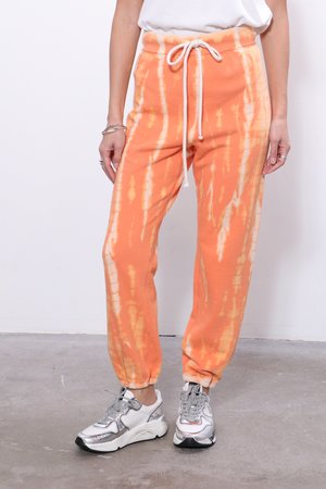 Raquel Allegra Athletic Sweatpants in Orange. Get cozy in RA hand dyed orange tie dye athletic sweatpants. Paired with Raquel Allegra Boy Tee in Washed White and Golden Goose Running Sole in White Nabuk Details Model 5'4 wearing size 0 | Model wears a size 0 (XS) in tops and size 24 (0) in bottoms. Details - 100% Cotton - Hand wash - Made in Los Angeles