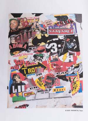 A collage T-shirt by artist Tetsuya Nagato. Color: White Material: 100% Cotton Size: M: Length 65cm, Width 57cm, Shoulder 51.5cm, Sleeve 20cm L: Length 67cm, Width 59cm, Shoulder 53cm, Sleeve 21cm XL: Length 69cm, Width 61cm, Shoulder 54.5cm, Sleeve 22.5cm
