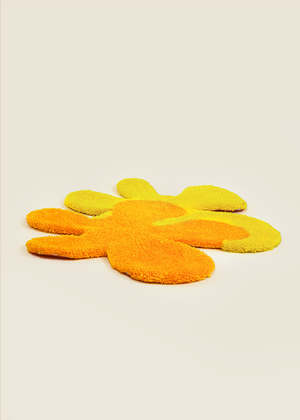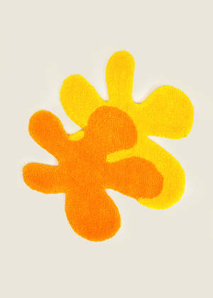 Shaggy hand tufted floor rug featuring an orange and yellow flubber. Felt backing. Can be hung on the wall. One of a kind. Each rug takes two full days to complete and is handmade by multidisciplinary artist Rashelle in Edmonton, Alberta, Canada. CARE Hand tufted rugs will take about a week to flatten out and recover from being rolled in transport. In order to keep colours from fading, keep rug out of direct sunlight. Instead of vacuuming, give the rug a little pat outside to let the dust out or use a sticky lint roller. MATERIALS Acrylic yarn. Felt backing. MEASUREMENTS Approximately 26" at longest width. Rashelle's Standards