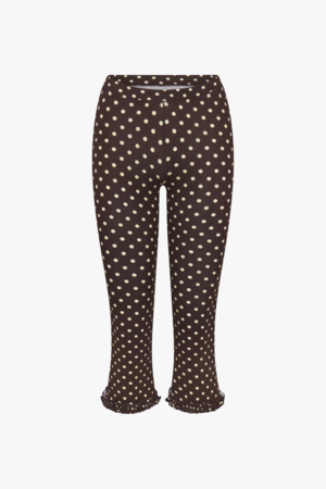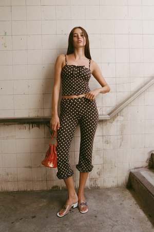 Sizes L and XL are on backorder, shipping mid to late February. Mid-rise capri pants made from thick, soft, breathable organic cotton. Each pair is fitted throughout the thigh with a slight flare at the knee and features handmade ruffles at the hemline. Dress up or down with the matching cami. Each pair is ethically made in Rat Boi's family-run factory in Los Angeles. MATERIALS & CARE 100% organic cotton We recommend washing on cold and laying flat to dry. SIZE & FIT Inseam: 23 1/2" Emilia is wearing a size S in this style.