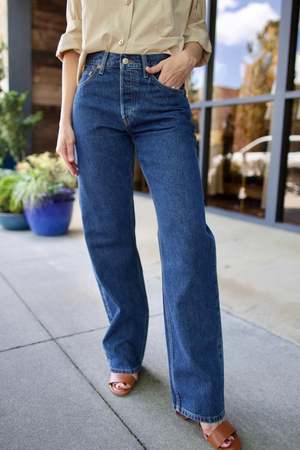 The 90's High Rise Loose jeans by RE/DONE feature a high rise and straight leg. Color: Rustic Indigo Fabrication: Cotton Fit Notes: These jeans run big.