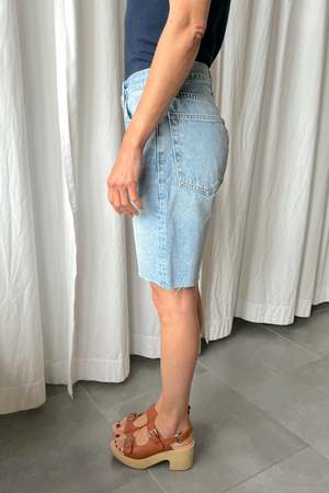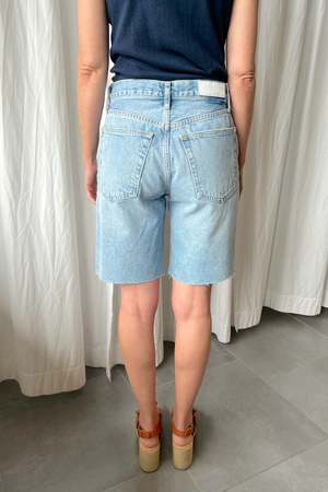 Mid-rise denim short with a button fly and relaxed fit. - 100% Cotton - Made in Turkey - Model is 5'8" and wearing size 26