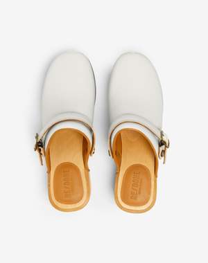 - Made of Italian suede and a natural-wood base - Fully leather lined upper - Beveled wood top edge - Platform-like height - Belt detail that can be used as a slingback - Style No. 305-14W7CC - Color: White Sku REDWPF22-10 Mpn 305-14W7CC Productcode REDWPF22-10