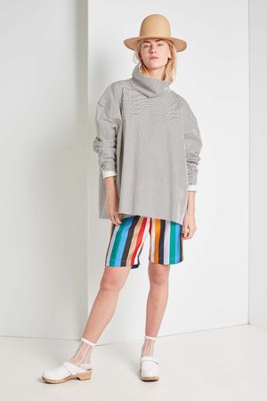Elastic waistband short in a silky striped fabric, kind of like a silky basketball short - Back pockets - Knee length, depending on your height - Fits true to size, model is 5'10" and typically wears a size XSmall and is wearing the size XSmall - Fabric: 100% Silk